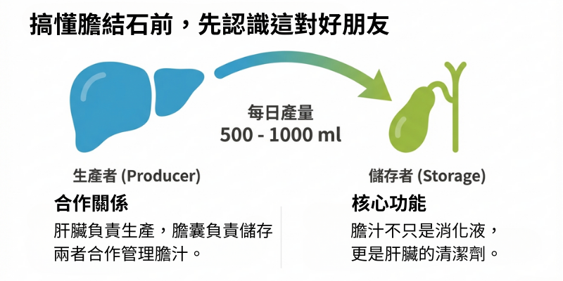 想搞懂膽結石,得先認識肝臟和膽囊這對「好朋友」怎麼一起工作,尤其是它們跟膽汁的關係。