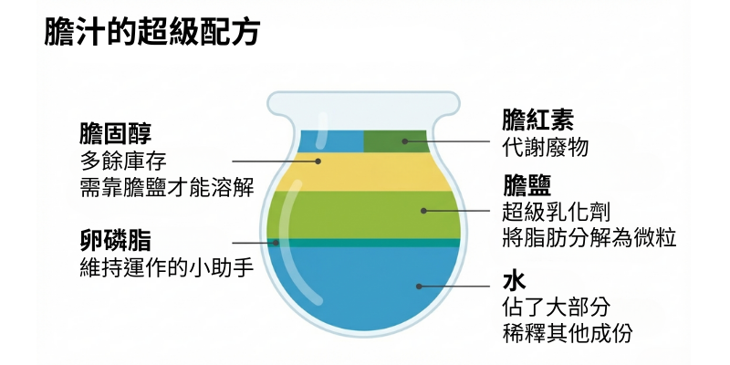 - 膽固醇:對,你沒看錯,膽汁裡也有膽固醇!肝臟會把身體裡多餘的膽固醇,跟著膽汁一起排出去。但問題是,膽固醇這東西不太溶於水,它得靠膽鹽和卵磷脂這些「好隊友」抱團,才能乖乖地待在膽汁裡不結晶。